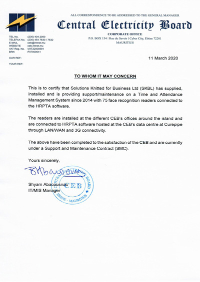 Today, SKBL is a trusted and reliable name for above services where it constantly improves existing products and services. It has successfully established a fruitful business relationship with its clients resulting in an impressively satisfied clientele of more than 800 customers in a very short time and with more than 3000 units in operations. SKBL valued customers comprise mainly renowned companies from various diversified sectors. Major leading companies like Leal Group, ABC Group, Evaco, Dream Price, Intermart, La Sentinelle, etc. Several Govt and para-statal bodies like Mins of Energy, Mins of Youth and Sports, Mins of Good Governance, Attorney General’s Office, National Audit Office, National Computer Board, Mauritius Post, CEB, CWA, BPML, GOC, NTC, SIC, RDA, MSA, MSTC, MIE, MES, OUM, MCIA, EWF, CPB are shouldered by SKBL for their HR/Payroll/Attendance / Access control requirements.